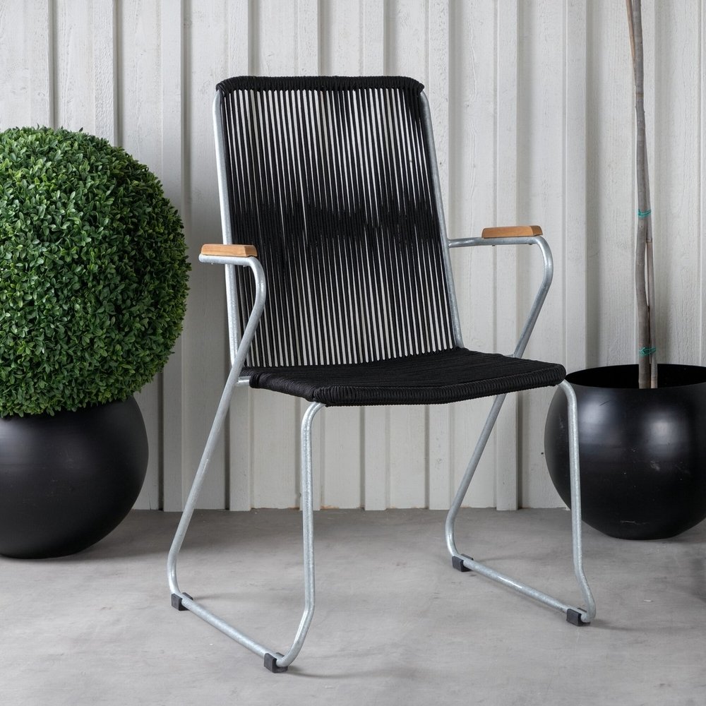 Modern, snygg och slitstark - en trendig stol med alla rätt! Bois har en bekväm design i zinkkonstruktion, sits i svart rep och dekorativa armstöd i teak. En möbel som bjuder in till många trivsamma stunder! Njut lite extra av härliga måltider utomhus och möblera altanen i en stilren anda. Stolen är stapelbar. Skötselråd:Våra rep är kvalitetsspunna polyesterrep som är lätta att rengöra. Möblerna är behandlade för att klara 500-2000 timmar. Vi rekommenderar såpa och vatten för rengöring. Låt lufttorka. För de områdena som är svårare att komma åt kan en liten borste användas försiktigt. Använd aldrig högtryckstvätt eller starka kemikalier för att rengöra repet.