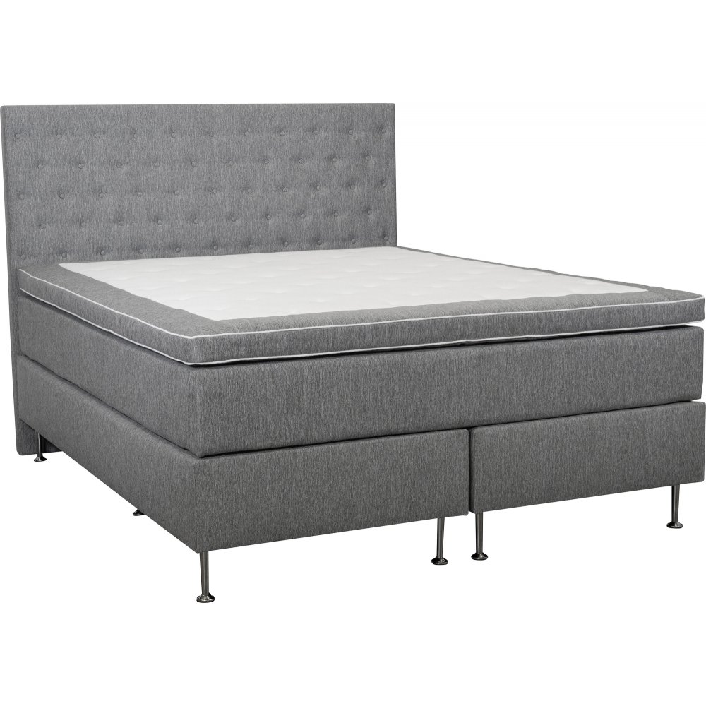 Sänggaveln matchar kontinentalsängen perfekt med sin grå klädsel och djuphäftade knappar som höjer designen och ger en ombonad mysig känsla. Gaveln är golvstående och kommer i samma bredd som sängarna.