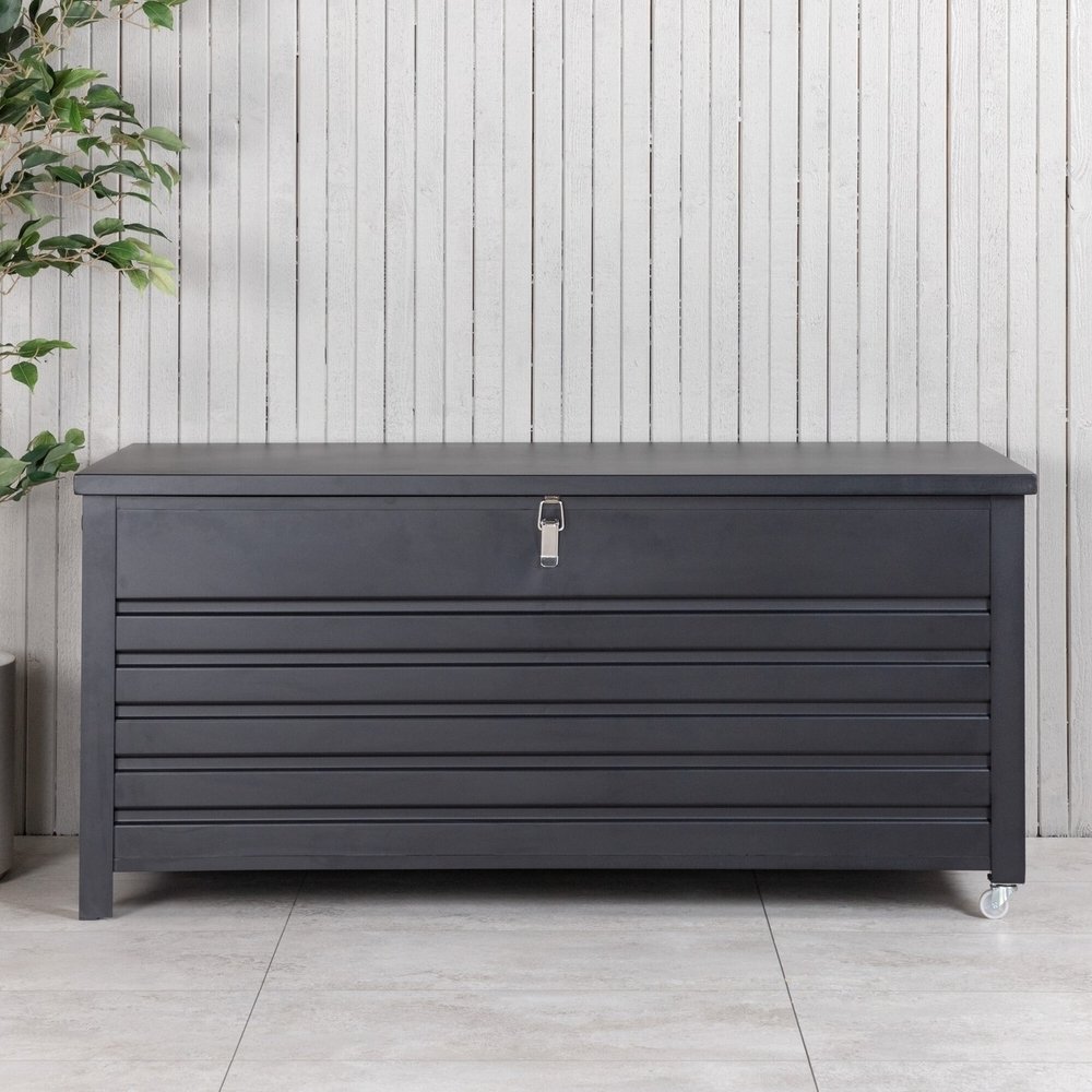 Elsa - vår praktiska svarta dynbox, den perfekta förvaringslösningen för dina dynor. Ta hand om dina dynor på rätt sätt, det kan förlänga livslängden! Vi tipsar! Utemöbler i aluminium och rostfritt stål bör rengöras regelbundet med vatten och mild tvål. Skölj alltid noggrant med rikligt med vatten, något som blir extra viktigt om möblerna är placerade på ett havsnära avstånd där salt kan transporteras via luften. Saltet kan leda till korrosion som kan orsaka flagning eller bubblor i lacken. Tvätta inte dynboxen med högtryckstvätt, ytan kan skadas av det höga trycket.