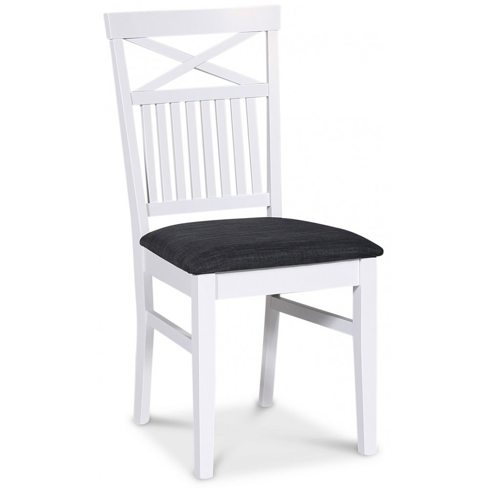 Fårö matgrupp från Skånska Möbelhuset, klassiskt matbord 160/210x90 cm med vitt underrede och en toppskiva i oljad ekfanèr. Det ingår 4 stycken matchande Fårö matstolar med kryss i ryggen, vitlackad trästomme med sits i grått tyg.
