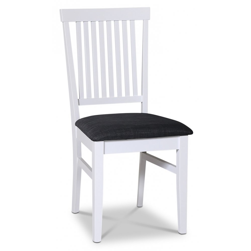 Fitchburg matgrupp från Skånska Möbelhuset, klassiskt runt matbord 106 cm i diameter, kan förlängas till ovalt bord 141 cm, med vitt underrede och en toppskiva i oljad ekfanèr. Det ingår 4 stycken matchande Fårö matstolar i vitlackat trä med sits i grått tyg.