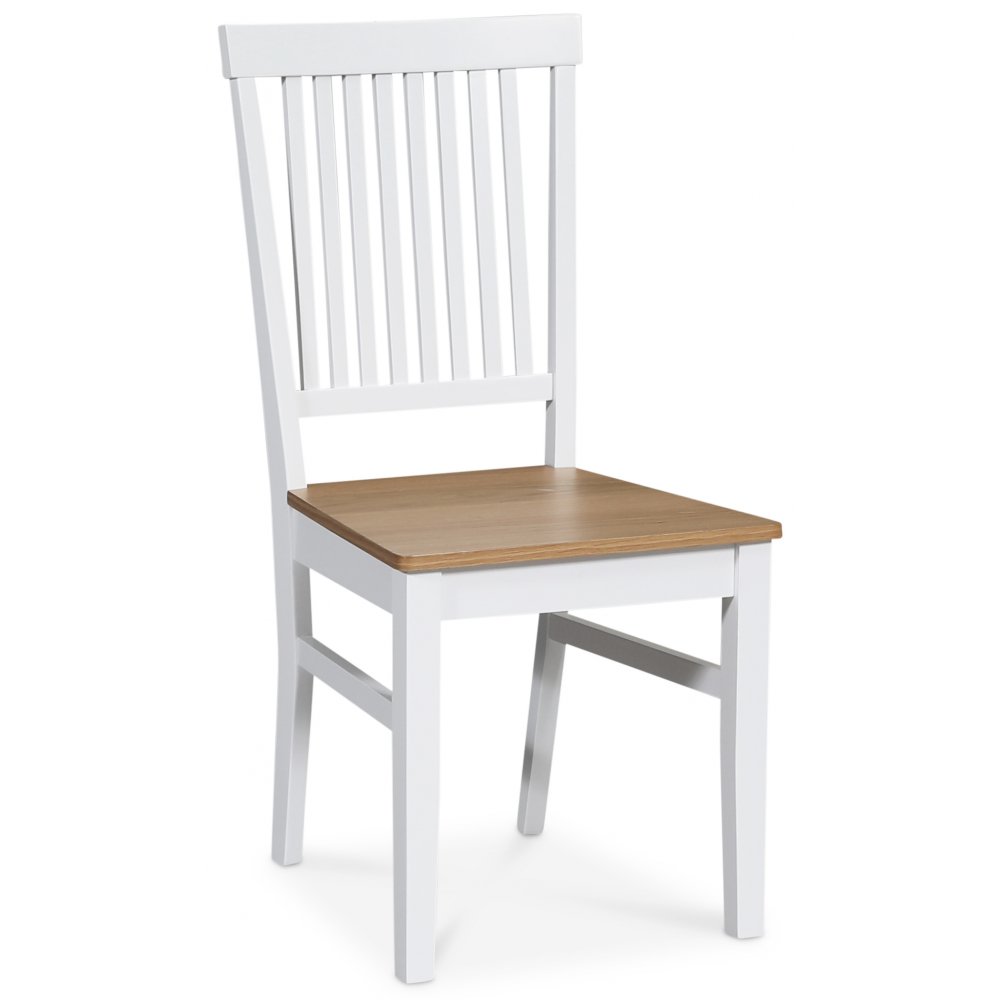 Klassiskt matgrupp, bord med underrede och toppskiva av massivt vitlackat trä. Modern stol i massivt heveaträ, vitlackad med sits av ekfanèr.