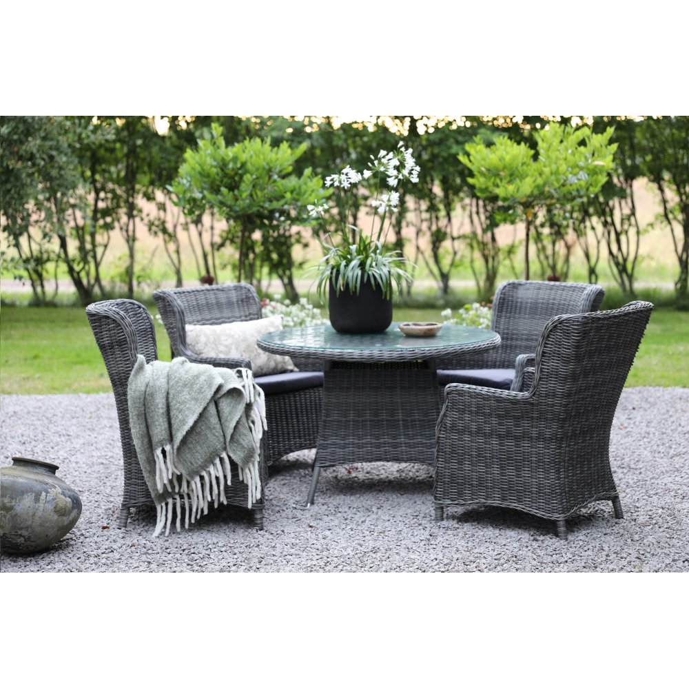 Matgrupp innehållande 1 st runt matbord i grå konstrotting med härdat glas som toppskiva, inklusive 4 st valetta fåtöljer i matchande grå konstrotting med sittdyna för bästa komfort. Matgruppen passar perfekt på altanen, uteplatsen och i uterummet.