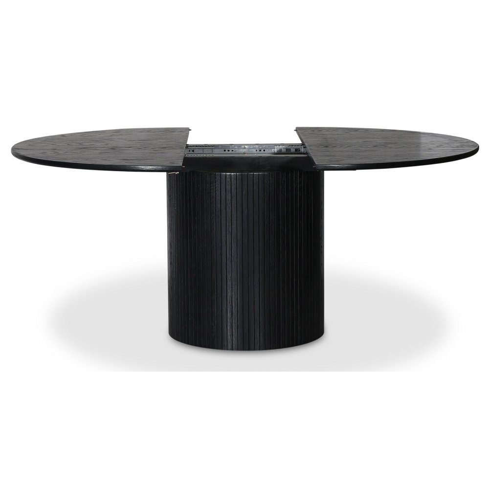 Matbordet är Ø130 cm i diameter, det ingår en tilläggsskiva som förlänger bordet till 170 cm. Iläggsskivan är vikbar och förvaras i bordets mittdel när den inte används. Bordet är byggt både i massivt trä och Fanèr.