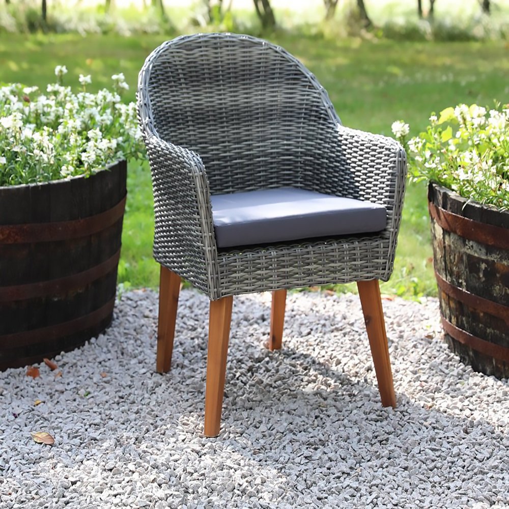 Inklusive 6 st Valetta stolar i cementfärgad rotting med bruna ben från Skånska Möbelhuset. Fåtöljen har mörkgrå sittdyna.
