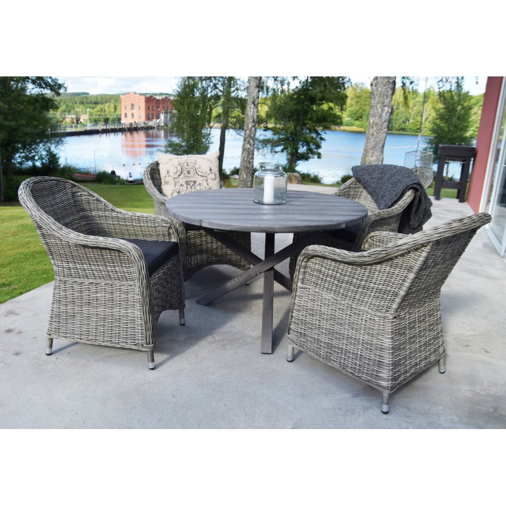 Scottsdale matgrupp för uteplatsen med ett runt rubust matbord, tillsammans med Ystad karmstol med skön sittkomfort. Bordet är tillverkad i grålaserad furu vilket gör utegruppen väderbeständig och tålig för att klara uteplatsens miljö.