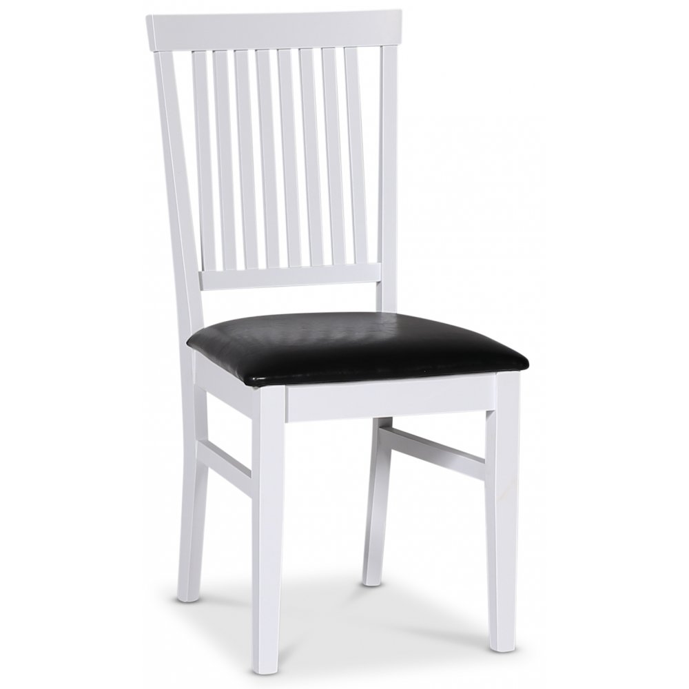 Skagen matgrupp från Skånska Möbelhuset, klassiskt matbord 160/210x90 cm med vitt underrede och en toppskiva i brunoljad ekfanèr. Det ingår 4 stycken matchande Fårö matstolar med ribbor i ryggen, vitlackat trä med sits i svart PU.